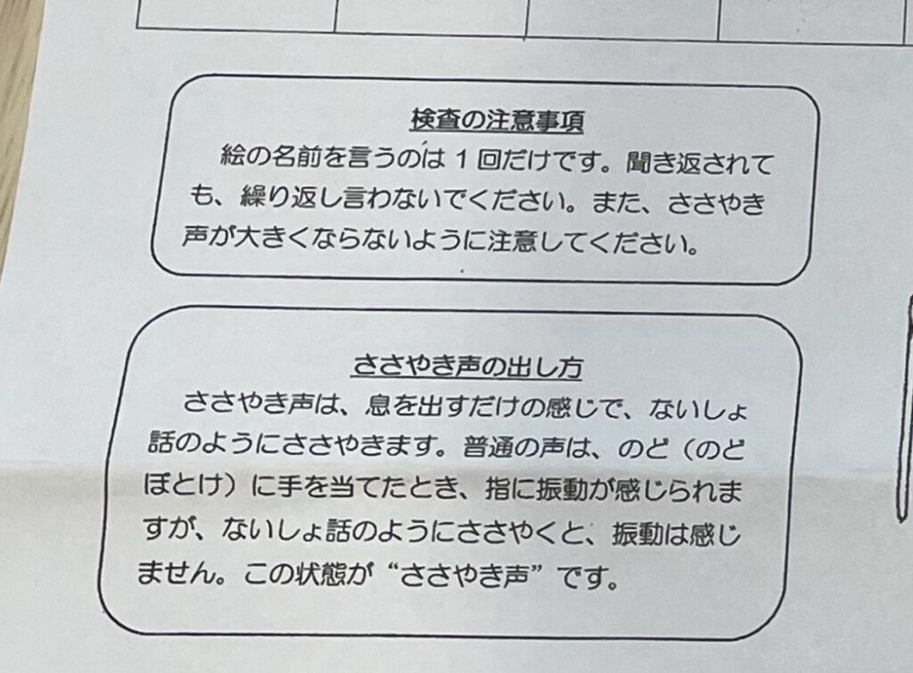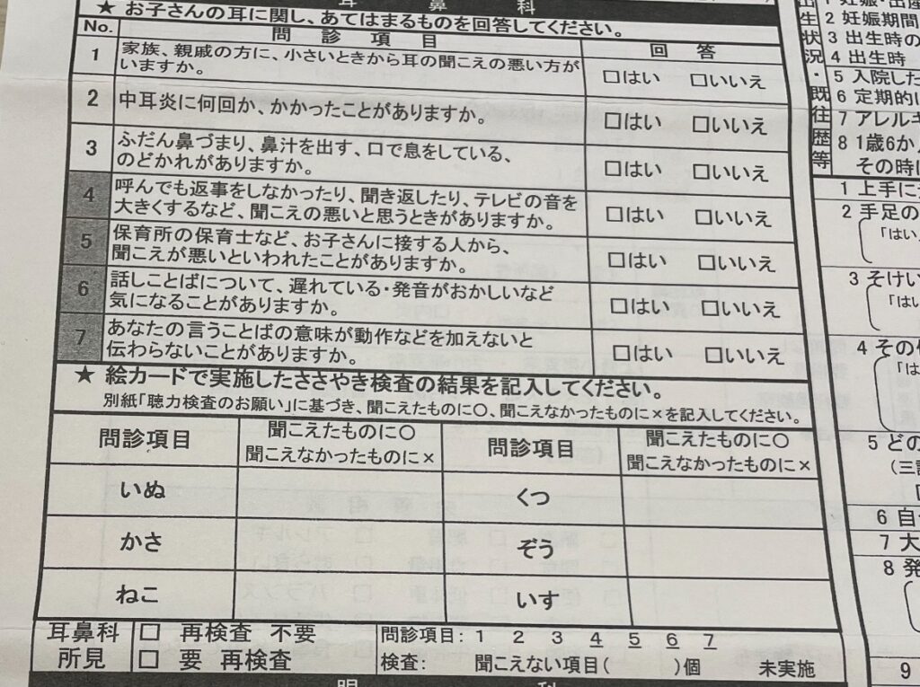 3歳児健診の聴力検査は、当日会場では行われず、問診票と家庭でのチェック結果をもとに判断されました。