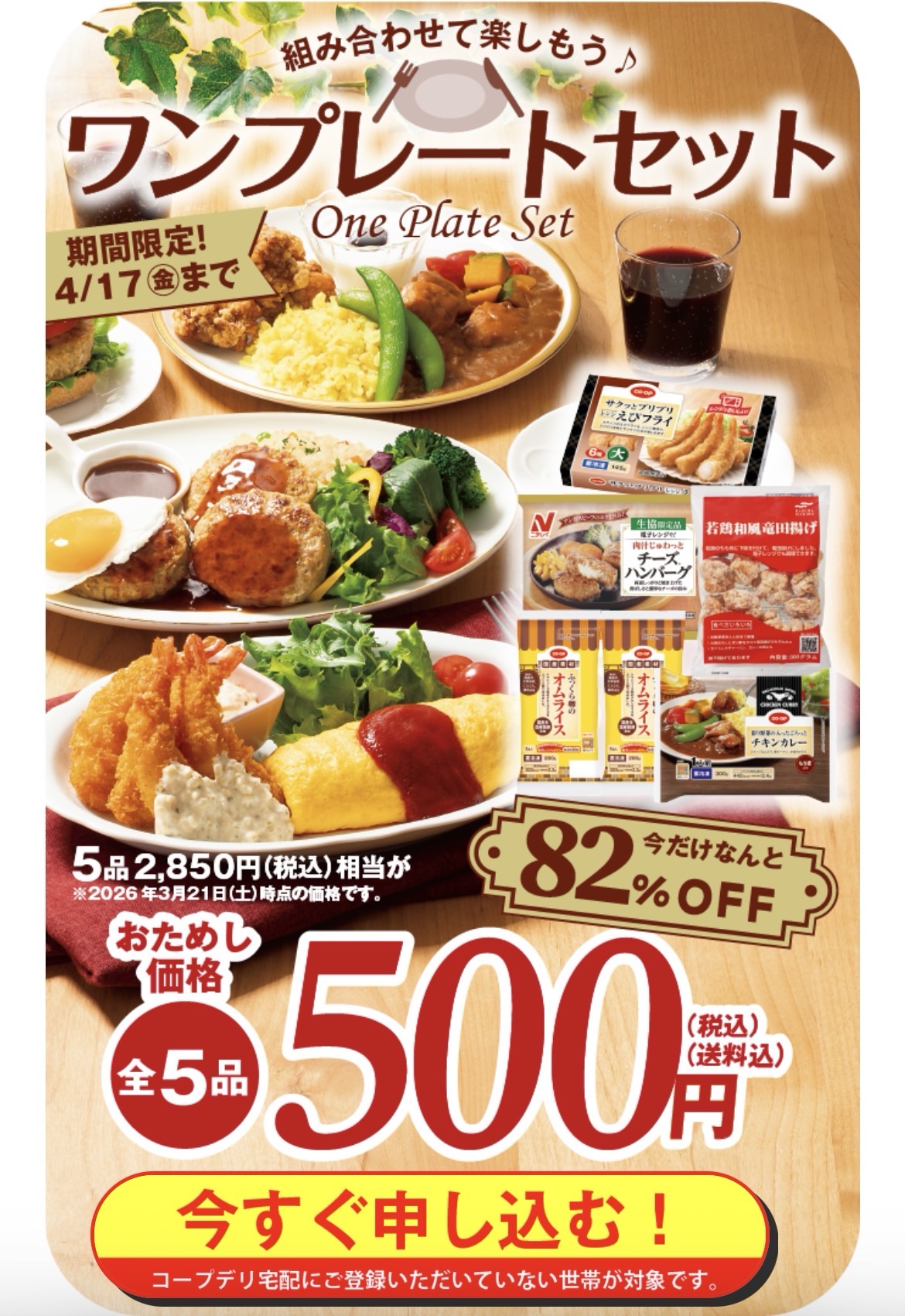 【期間限定4/17まで】ワンプレートセット5品・500円のキャンペーン概要
