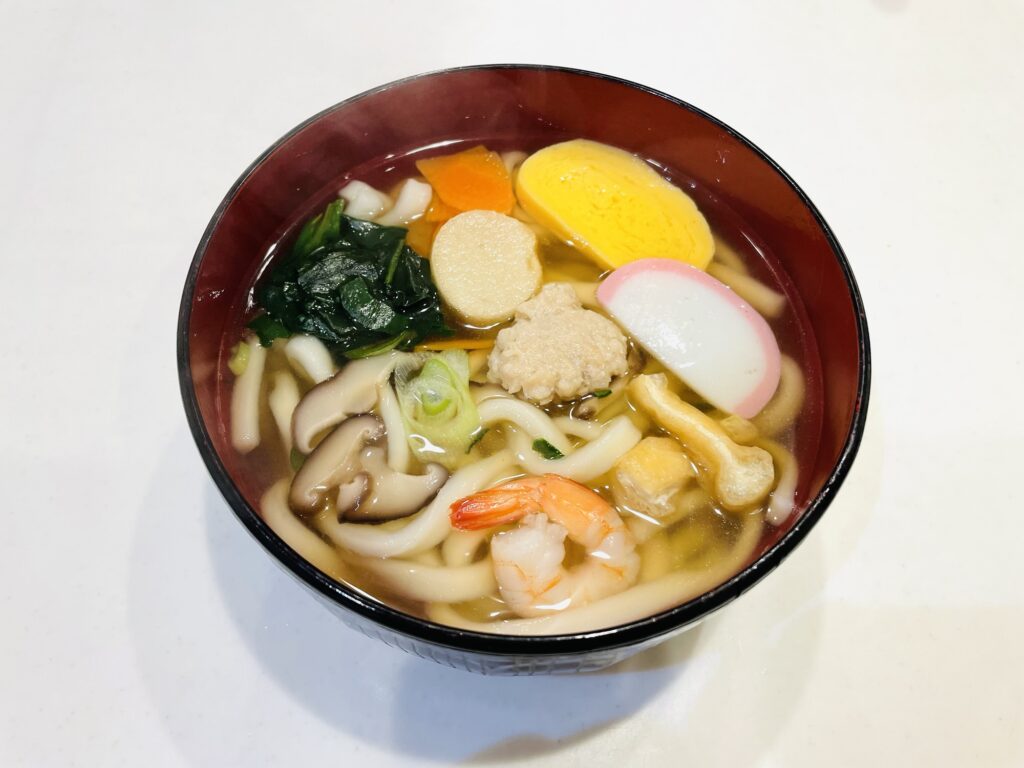 海老・玉子焼き・かまぼこ・肉団子・お麩・ほうれん草・人参・しいたけ・油揚げ・ねぎと、具材は10種類で具だくさんなので、これ一杯でも満足感があります。