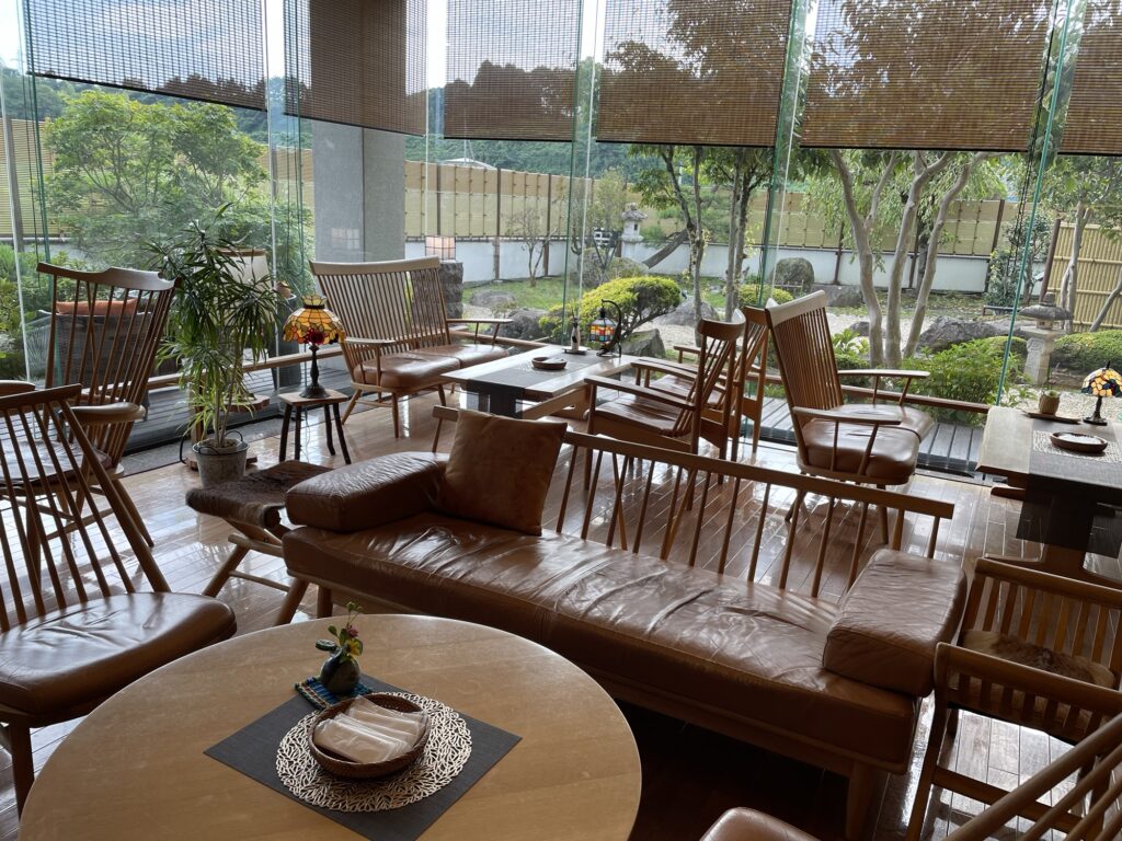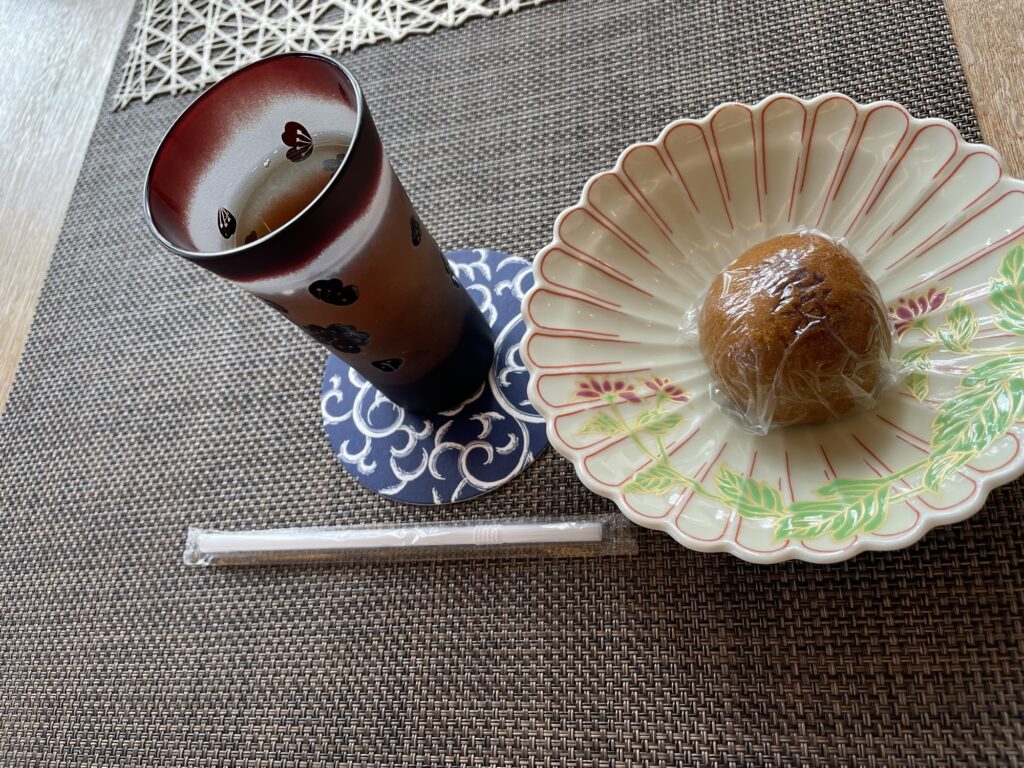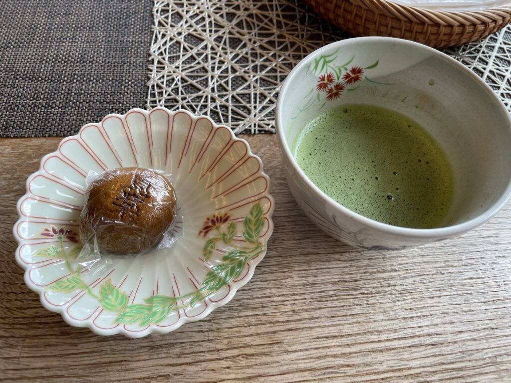 チェックインを済ませたら、ラウンジでお饅頭と抹茶のサービスがあり、ほっと一息🍵
