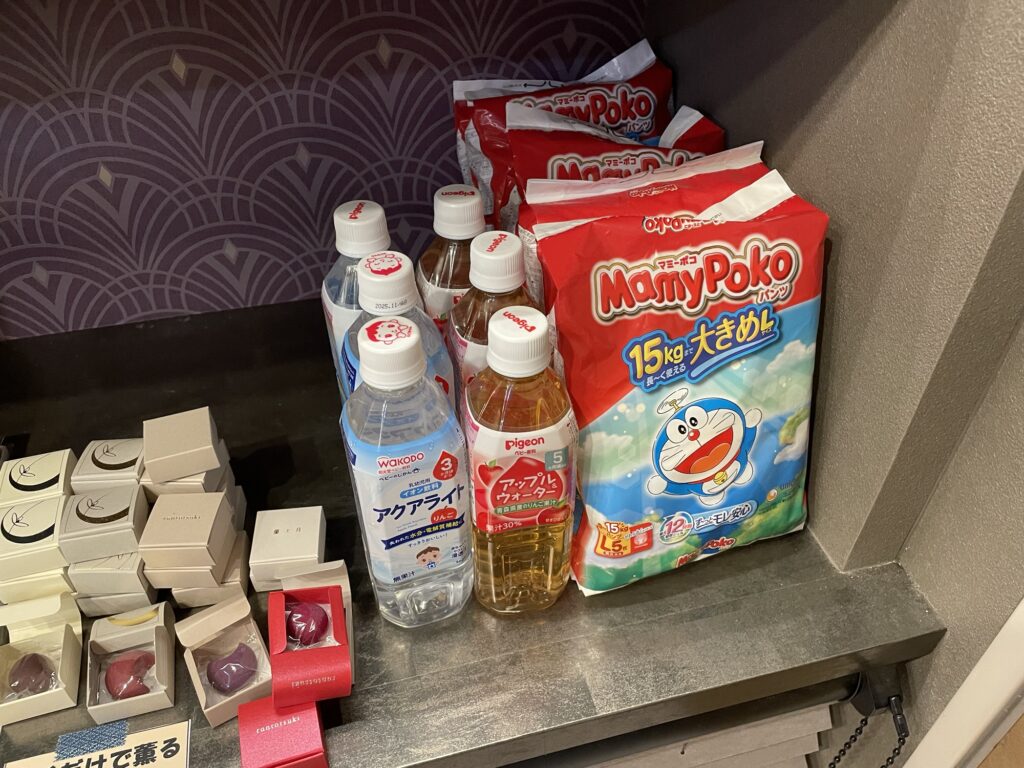 オムツ(Lサイズ・パンツタイプ)や子ども用の飲料水も置いてあり、子連れにはありがたい✨