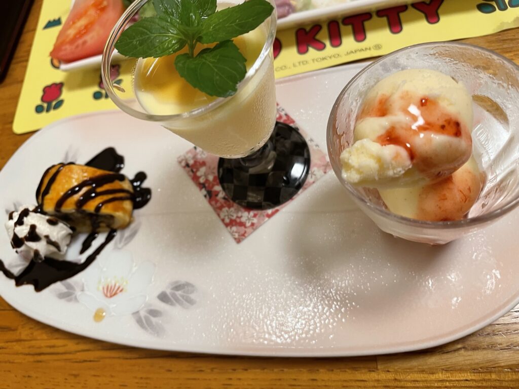 フルーツがついていたのに、大人のデザートが運ばれてきたタイミングで、子ども用にもアイス&プリンのプレートがでてきました🍮✨