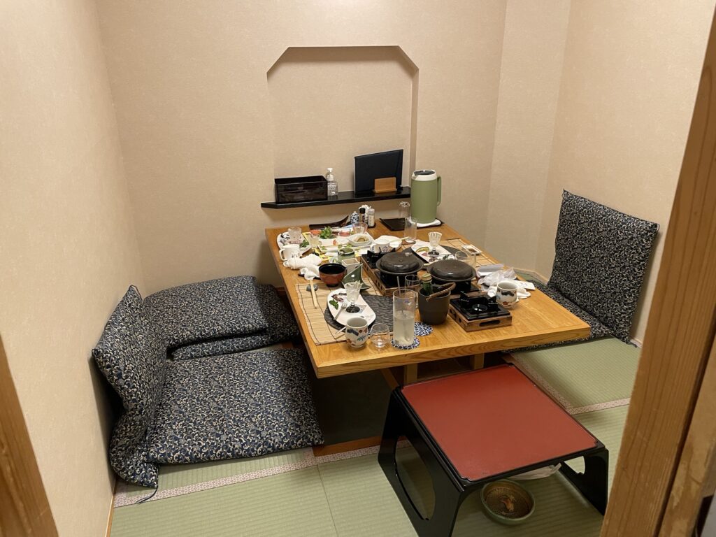 会場は個室の掘りごたつ席で、夕食も朝食も同じ部屋でゆっくりいただけます🍽️