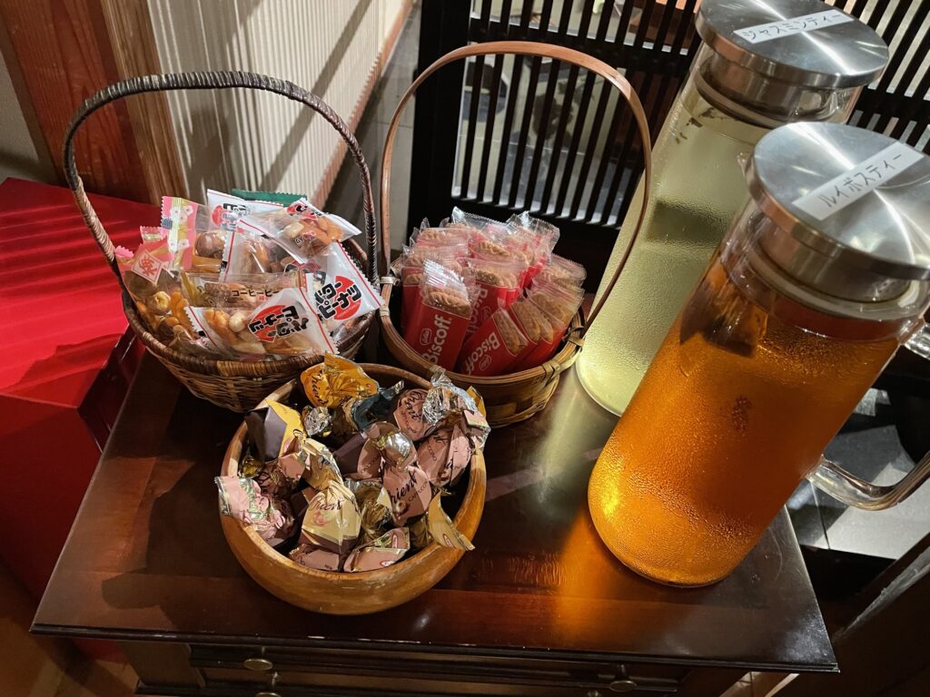 朝は、コーヒー・紅茶・ノンカフェインのアップルティーとお菓子が置かれていて、チェックアウト前にほっと一息つける空間になっていました🍎